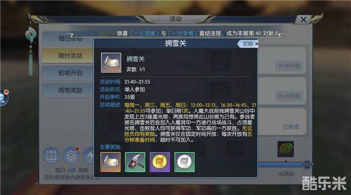 在拥雪关开启日的13:00-13:15、16:30-16:45、21:40-21:55三个时间段可以参与拥雪关。人魔大战前线拥雪关山谷中发现上古三座星光塔,参战者报名拥雪关后会代表其中一方进行战斗,击败敌人或者占领星光塔都可以获得军功,军功高的一方可以获胜。大家需要注意的是每次战场开放有五分钟准备时间,超时后就不能报名参与了。