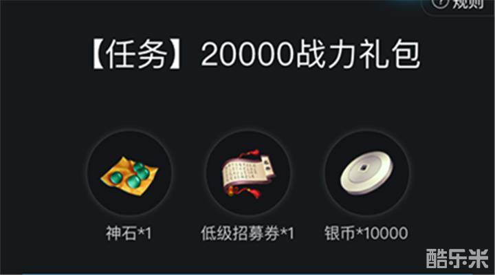 5000战力助力礼包:5000银币、1颗一阶强化石、1张藏宝图;10000战力礼包:6000银币、1颗神石、1张藏宝图;15000战力礼包:80000银币、1张低级招募劵、1张藏宝图;20000战力礼包:10000银币、1张低级招募劵、1颗神石。