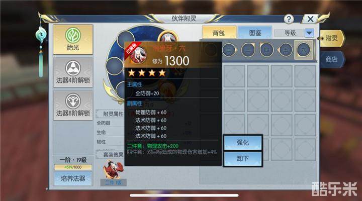达到50级后会解锁附灵系统,随着法器等级的提高,共有三个附灵转盘先后解锁。在每个附灵转盘上可以附灵六颗灵石。
