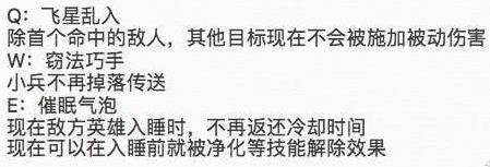 可以看到Q技能再次被削弱,W技能不再可以从小兵那偷取传送,而E技能也遭到了大幅削弱。