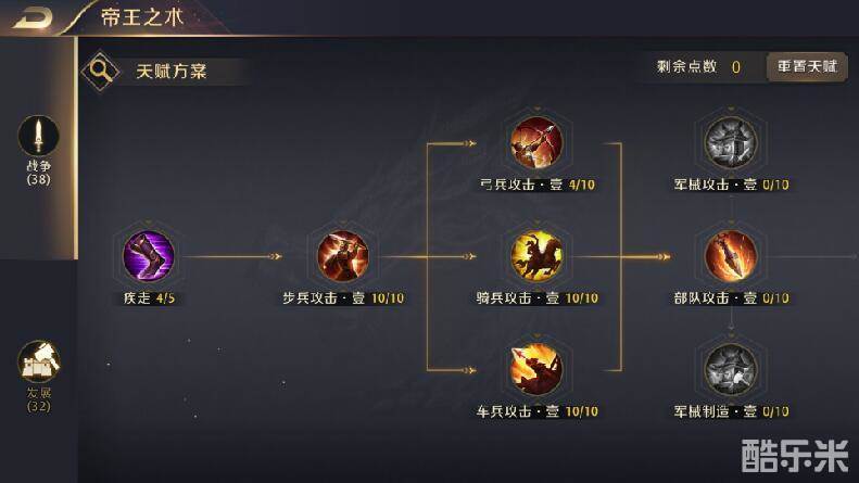 帝王之术分为两大方向:第一是战争方向,第二是发展方向。往哪个方向发展全凭主公决定。若主公是内敛沉静型性格,不喜争斗;那么可以侧重发展方向;若主公骁勇善战,十分享受与其他城主争夺资源的过程里,那么可侧重战争方向。战争方向的天赋方案侧重于对兵种的属性加成;有提升攻击野怪和神兽时的行军速度、有提升步兵、骑兵、车兵的攻击力、防御力和生命力。但是对神兽、副本、竞技场无效。同时也提高军械的攻击力、防御力和建造速度等。