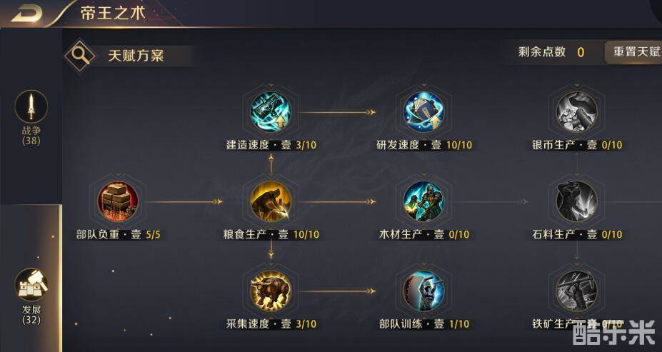 发展方向侧重于对城市建设方面的属性加成。包括提升部队负重,提升粮食、木材、石料、铁矿、银币等所需物资的产量;提升城外采集速度、书院研发速度、士兵训练速度等方面。主公初入真龙霸业,应该多囤粮、高筑墙,提升自己的实力才是硬道理,把发展视为第一要义,毕竟城池强大才能应对各方威胁。