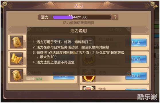完成活动列表中的日常任务活动,可以获取活跃度,每获得1点活跃度可回复一些活力值。获取的数量根据玩家自身等级而定,1点活跃度=2.5+0.075*玩家自身等级,最大为10点。