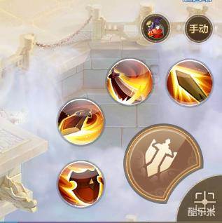 在游戏图面的右下角,有一个小小的战斗操作界面,在这里我们可以看见有4个主动技能,像这样子的——