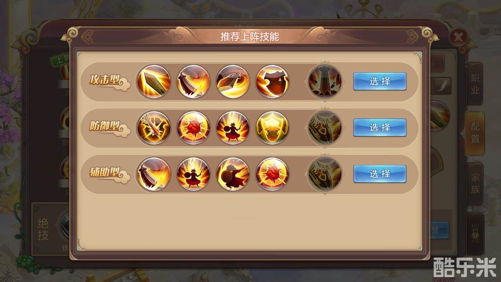当然,如果不知道用什么技能好,可以点击“推荐上阵”按钮,选择系统为你推荐的技能搭配,有攻击型,防御型,辅助型三种,找到适合你的技能组合之后,点击右边的“选择”键就可以啦~