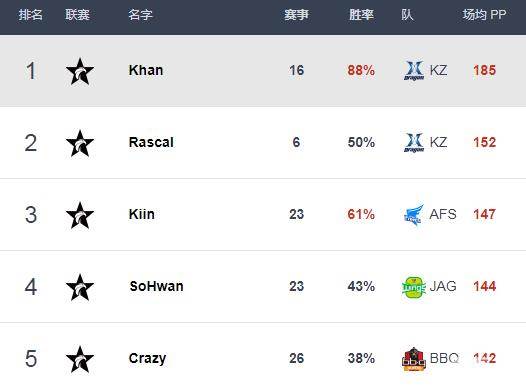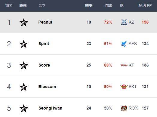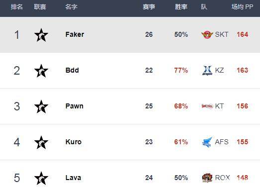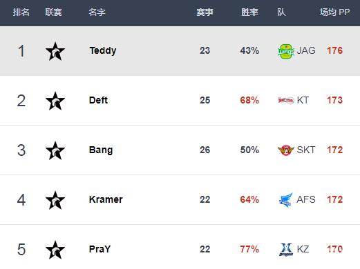 今日国外知名数据网站Best.gg更新LCK各位置选手最新排行榜单,KZ上辅野三人获榜首,SKT.Faker重夺第一中单宝座,在昨日拿下五杀的JAG.Teddy略领先Deft位局AD榜第一。