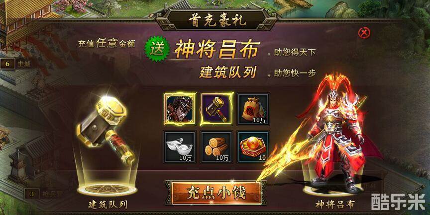 我们便会看到,其中出现了充值任意金额,送神将吕布,助您得天下,建筑队列,助您块一步的首充豪礼界面。在界面中,根据提示,玩家只要充值任意金额(最低10元宝),便能获得紫将吕布1枚,建筑队列增设1格,粮食10万,银两10万,木材10万,威望1000点。
