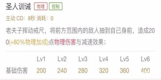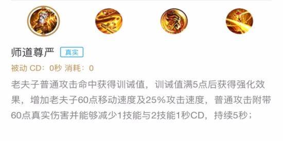 老夫子普攻可以叠加训诫值,满五点后强化普攻附带真实伤害,增加移速与攻速,并减少一二技能1秒cd,此技能决定了老夫子需要不断的与敌人进行贴脸普攻打出被动,提高伤害。被动所附带的真实伤害可以帮助老夫子不需出太多攻击装就可以打出高伤害。