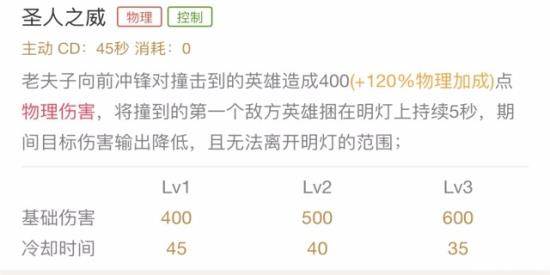 老夫子向前冲刺对撞到的绑在孔明灯上持续5秒,期间降低目标输出,切敌方无法离开明灯范围,此技能是老夫子与敌人进行单挑的核心技能,在对线与人单挑时,一定要有此技能,团站时将敌方c位捆在明灯上,限制敌方走位,方便己方刺客击杀。
