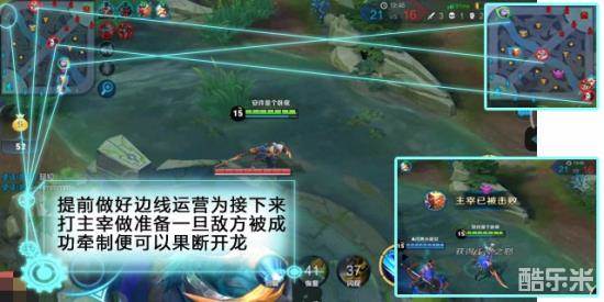 中后期的铠在有了前期稳定的经济之后单带能力便非常强势,此时可以通过兵线控制来稳定己方节奏,四一分推对于带线能力极强的铠而言是非常实用的。而且关键点是在中后期控住兵线的压力可以让己方随时选择开龙,无论是暴君还是主宰,如果此时敌方想要抢夺整个战场便会陷入拉锯战,只要我方不开龙对方不敢轻易上,而对方不上在拥有边线优势的情况下我方完全可以与对方拉锯消耗,最后他们还是得回去守线,而一旦对方少人我方便可以选择强行以多打少逼团或者轻松的拿下主宰/暴君。