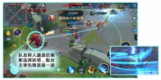 后期在有了主宰先锋的优势后便可以果断与队友配合压进,因为是无射手阵容,所以在压塔之时相信很多小伙伴会陷入无人点塔的尴尬中,此时其实不必过于心急,首先要清楚敌方的阵容特性,比如敌方有木兰、嬴政这类强行守塔的英雄可以通过三路运营来分路突破,此时最忌讳的便是不顾边路盲目的在中路与之消耗,因为一些守塔强势的英雄单路守兵非常容易,如果固执的在中路消耗会造成主宰先锋一路一路的依次被清理殆尽,无法发挥其效果。