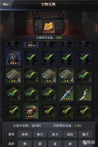 另外,有个小技巧就是,主公们记得多攒“珍宝鉴”,虽然在鉴宝的时候一般概率调到80%即可,但是最好还是概率调成100%最佳!因为珍宝鉴数量实在太过稀有,一旦脸黑转换失败便得不偿失!而概率100%便不会失败了!主公们快快整顿自己的宝物,令其属性技能都发挥最大效益吧!