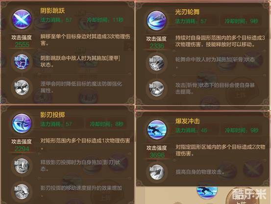 剩下的这四个技能,虽然没有太强的辅助效果,但是伤害强度很高,且所带被动效果能从各方面提升打怪效率。阴影跳跃可降低敌人双防;光刃轮舞可提升自身暴击;爆发冲击可提升自身攻击;影刃投掷可提升自身速度。