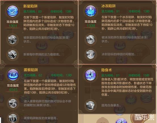 所以爆裂陷阱这种被动增加伤害,效果就显的非常鸡肋了。因此,选择其它三个陷阱再搭配隐身术,进行辅助攻击更显合理。新星陷阱被动减少敌人魔法值;冰冻陷阱被动可冰冻并持续伤害敌人;蒺藜陷阱被动降低敌人移动速度;隐身术可进入隐身状态。