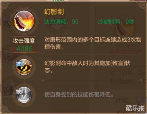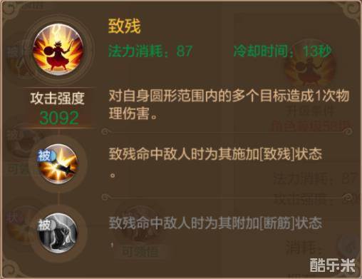 致残,辅助剑客第二式,和幻影剑类似的技能,进一步深化了群伤、降低对方魔攻物攻、以及减速等负面效果。只要能打中人触发效果,伤害什么的都不重要了,交给队友就好。