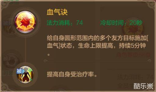 血气诀,不论在PVE还是PVP的战斗中,它都是一个万金油的技能,提升血量上限总是没错的,所以在众多技能选择中,将第四个技能栏留给了它,毕竟“活着”才是硬道理。