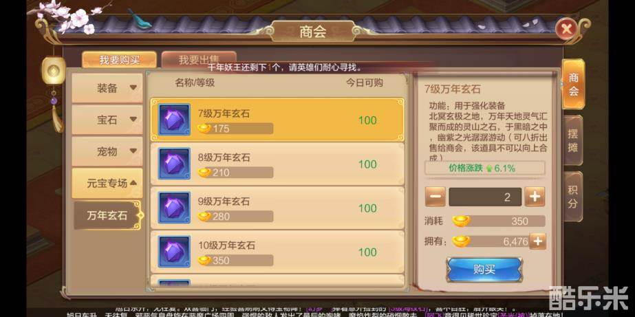 需要的各类玄石在日常活动中即可获得,尤其是寻宝活动更是获取各类资源的捷径。当然如果条件允许的话,也可以直接用元宝在商会进行购买。