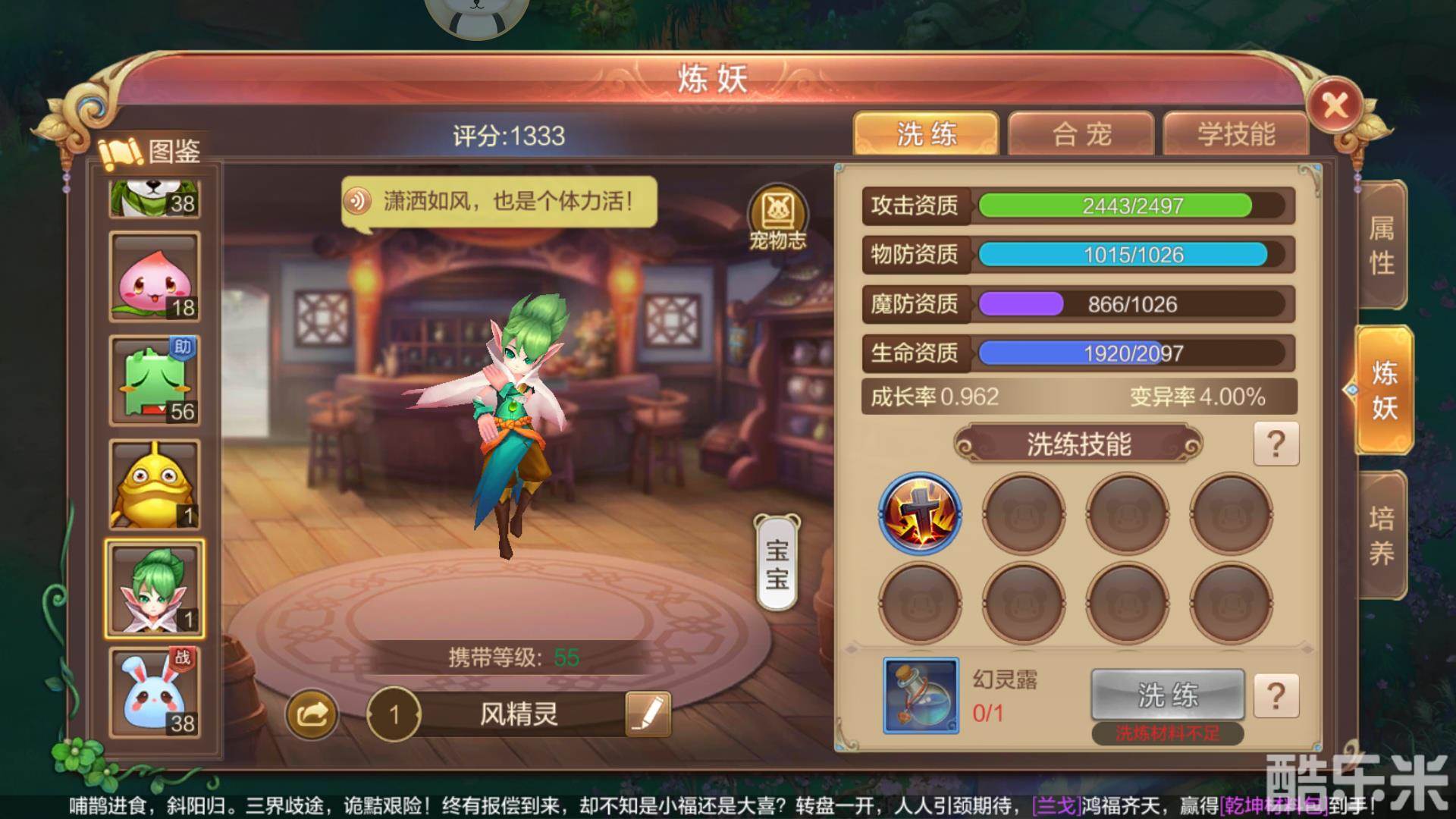 炼妖是宠物变强的唯一途径,使用幻灵露可以进行宠物的洗炼,洗炼的同时是有一定几率让宝宝全满资质且满5技能的呢。当宝宝变异之后是无法在洗炼的了,而且神兽、宝宝、特殊宠物是无法通过合成来获得新的宠物的。宠物的技能开槽只能手动开到第四个噢,当宠物已有4个技能或4个以上的技能,使用技能书只能顶掉原先的其中一个技能,无法获得新的技能呢,下面我们就来看下宠物的各项属性吧。