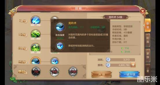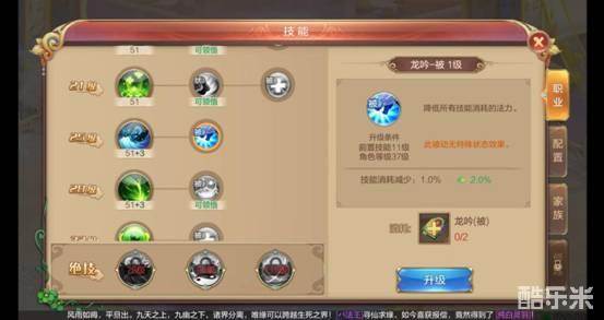 龙吟-被:降低所有技能的法力,个人觉得没有必要,这些法力的钱和技能书比起来,小巫见大巫啊,只有在技能无缝衔接期,法力回复不够用的情况下才可能会去点这个技能吧。