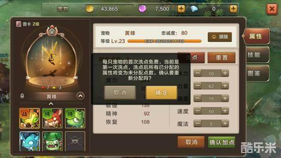 决定加点方式后,点击确认加点后就不可以更改了,若是想洗点,则需要点击洗点按钮。每只宠物首次洗点是免费的,此后洗点会收取一定的钻石作为洗点费用。