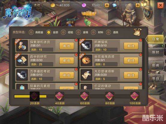 活动:这里是玩家能进行的所有活动的汇总,但凡能做的都用红点标示了,还可以通过分类,挑选不同报酬的活动来做,可以说十分的方便。