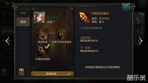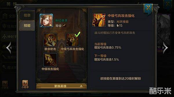 2、中级弓兵攻击强化:战斗时增加己方全体弓兵的攻击,技能一级时增加弓兵攻击0.75%,下一级增加至1.5%。