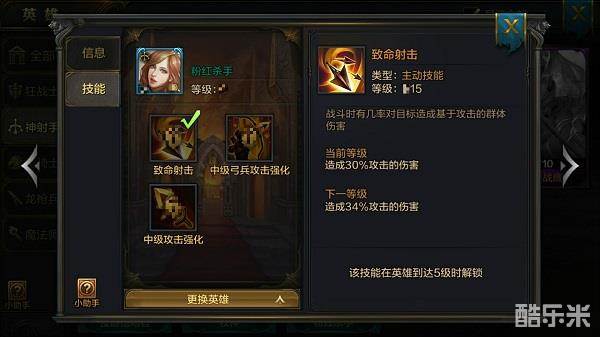 1、致命射击:战斗时有几率造成基于攻击的群体伤害;技能一级时造成30%攻击的伤害,下一级造成34%攻击的伤害。