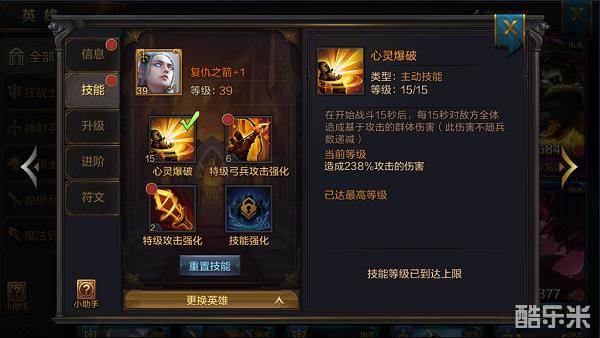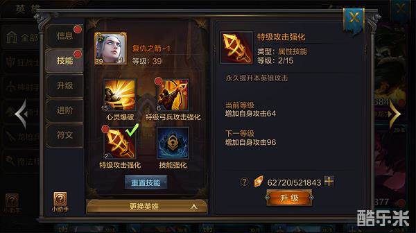解析:本技能35级解锁,之前的技能增强己方全体弓兵的攻击属性,而这个技能则是增加英雄自身的攻击属性。做为特级技能,其每升1级增加攻击32,非常的变态。