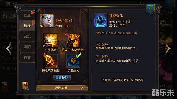 解析:40级解锁,橙色英雄的特色技能。主动技能做为一个英雄的招牌,是非常重要的,这个技能可以强化英雄的主动技能伤害,收益也是非常可观的。