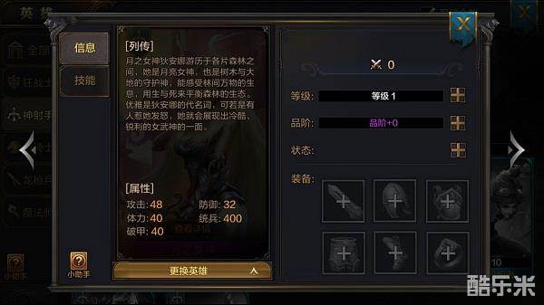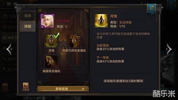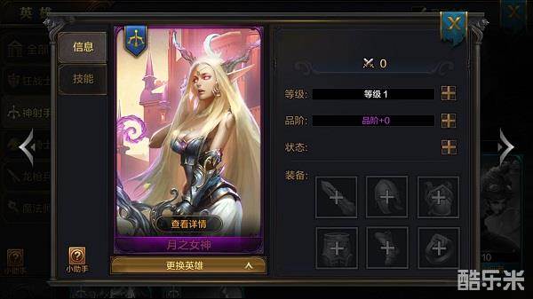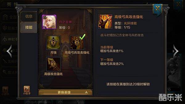 1、英雄升级:通过购买优秀经验卡,优良经验卡和史诗经验卡来为英雄升级。也可上阵英雄攻打试炼塔获得经验。月之女神的统兵能力还是比较强的。