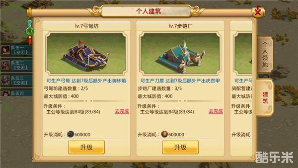 而我们可以在个人领地里建造相应的兵种设施,比如你队伍里以弓兵为主,可以多建几个弓弩坊。不过要注意的是,骑配营、弓弩坊和步铠厂这三个建筑是共用额度的,要建哪些就根据自己的需求哈。