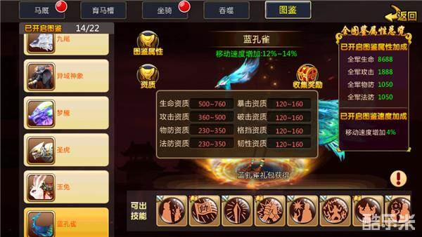 在资质属性方面,孔雀跟之前的圣虎是一样的,不过要注意的是它没有专属的图鉴奖励。