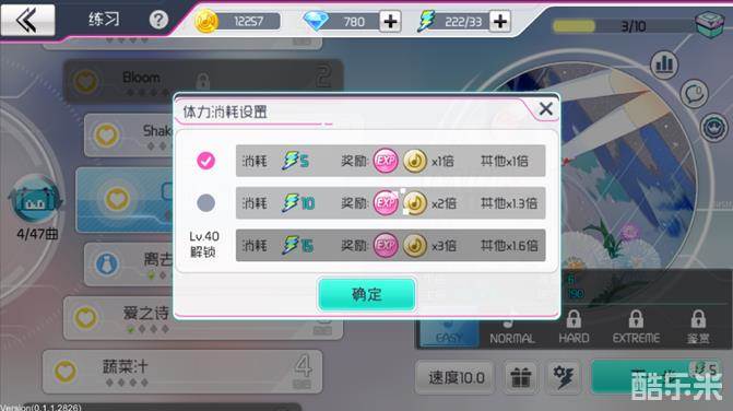 3) 在歌曲信息界面可点击【设置】按钮查看体力消耗设置,消耗体力数量越高,奖励获得越好。