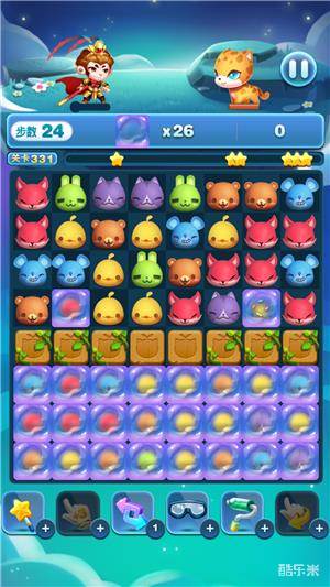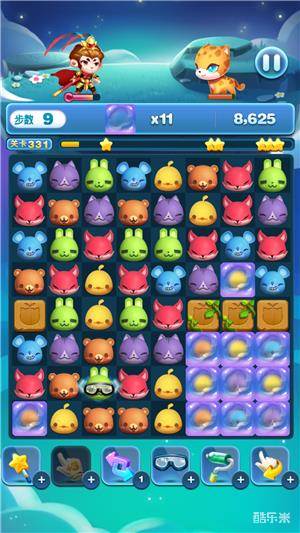 在消除进行到后期的时候,所剩余的果冻已经很少了,这个时候大家所面临的问题就是关卡两边那些残存的果冻,这些果冻由于位置的关系,比较难以清除。我们可以借助横目射眼镜的特性,来对这些果冻进行清理,而这些单层果冻清理起来也比较的方便。
