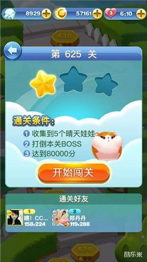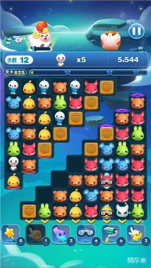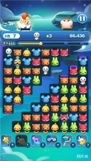 此关卡的主要任务就是收集晴天娃娃,也就是将娃娃从绳索上面解救出来,然后慢慢的将它们移动至下方箭头指向的位置就可以了。首先从地形来分析;这一关分为两个独立的区域,一个是左上方,另外一个是右下方,这两个区域都呈梯形结构。这一关的步数一共是23步,步数不是很多,所以我们在消除的时候一定要仔细的利用好每一步,这五个晴天娃娃都位于左上方的位置,并且在他们的下方都被木箱困住了,所以我们首先需要突破这些障碍,并且把娃娃解救出来。