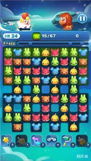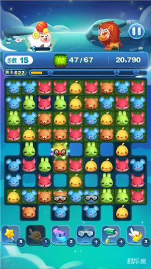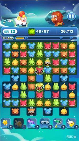 通过对图中的观察我们可以发现图中上半区域的草坪是非常容易铺设成功的,而下半部分相对来讲要麻烦一点;最难的可能就是底部区域四个凸出来的小方格,因为在他的左边和右边都没有任何的棋子,可以说这四个是独立存在的,所以要想铺满他们就必须竖向的消除棋子才可以。好在这一关的障碍非常少,可以说没有任何新的元素出现,我们只需要一心一意的铺草坪平就可以了。在铺设草坪的过程中除了可以利用棋子自身的特性消除同色的棋子,也可以多制造出一些特殊道具来帮助铺设,这样能节省更多的步数。