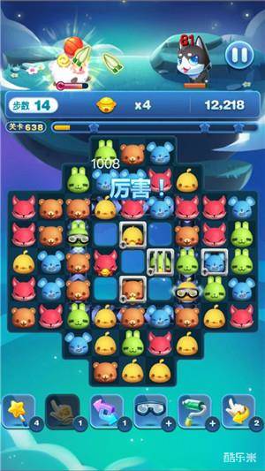 通过对图中的观察,我们可以发现这一关一共有20步,步数不算很多,所以我们在消除的时候每一步都要谨慎小心,并且这一关中我认为最困难的就是六个框架牢笼的障碍,它们将铃铛棋子都困于其中,我们首先要做的就是将这个牢笼打破,但是它们都是三层的,需要我们消除三次棋子才可以。想要将这些牢笼全部都打破仅仅依靠普通棋子的消除是绝对没有办法完成的任务,因为它们都位于独立存在的区域普通的棋子根本无法靠近它们,所以我们只能在棋子相对集中的地方来制造出像目镜射线,或者是旋风小丑这样的特殊道具来帮助我们去打破它们。