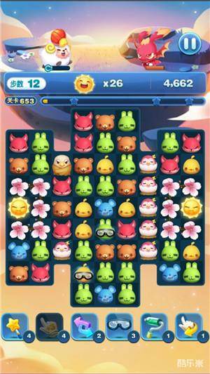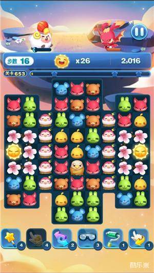 本关的主要任务是收集阳光,收集阳光本身并不是很难,步数仅仅20步,接下来我们看看此关地图的基本形状以及障碍物设置的基本要素。首先地图是不规则的,大致呈现出:左右和中间三个区域,只有两个大太阳,分别分布在左右两列,而大太阳周围我们可以看到有一圈樱花包围着它,这是我们接近大太阳的其中一个障碍。除此之外,在中间的过渡阶段,分别由五个小鸡仔挡住了去路。老鹰,目前在中间的正上方,我们需要将老鹰引到两边抓到小鸡仔,才能进一步接近大太阳。所以障碍还是比较多的,这个时候步数就是比较棘手的问题了,只有20步,要抓到十个鸡仔还要消除樱花还得收集阳光,所以每一步都很珍贵。为了降低点难度,所以此关并没有出现紫色棋子在道具上我们是有一定优势的,要把握住这个优势才能有机会通关哦。