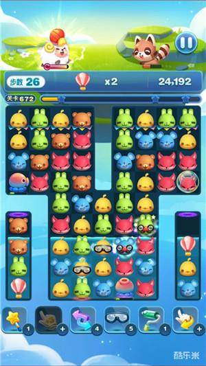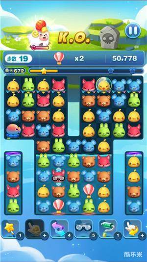 除此之外我们还可以看到在底部和右上角的位置都有个大章鱼,并且它们在不断的向它的周围吐泡泡来困住棋子。而消灭一只大章鱼要需要7步,但是在这关中我认为消灭它们是必要的,所以应该放在首要位置。消灭它之后我们移动棋子就会简单的多了,热气球也会很快的通过虫洞移到中间来,这时候我们只需要有序的消除热气球上方的棋子就可以了。而且这些都还是很容易的,因为道具出现的数量很多,我们很容易就能完成指定的目标了!