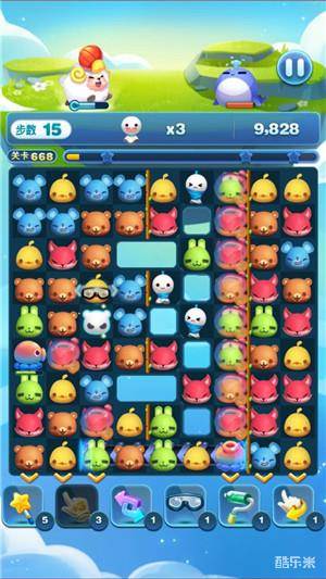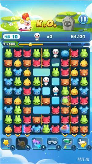 经过上面的简单分析,此关地图的缺陷对关卡的运行还是有很大影响的。不过仔细观察我们可以发现收集口只在左右三列的下边的黄色三角区,所以即使晴天娃娃调到传送带上我们也要想办法让它们移到收集口才行。所以总体而言难度还是比较大的,这个时候我们可以看到下方的章鱼已经吐出了一整列水泡将竹笛这侧得棋子完全控制了。为了降低难度,此关并没有出现紫色棋子,所以在道具方面我们要把握住机会,在左右两边宽敞的地势中多多抓住制作道具的优势。大概四五步的样子,我们可以看到章鱼吐出的水泡并没有消除,因为章鱼一日不消除,它们就会不断地吐出水泡,是个非常棘手的事,好在这个时候我们已经成功的制作出了特殊道具来协助,可以看到幽灵旁边有目镜射线,这个时候只要交换它们的位置就可以引发全面的垂直效应了。