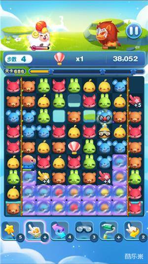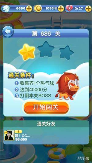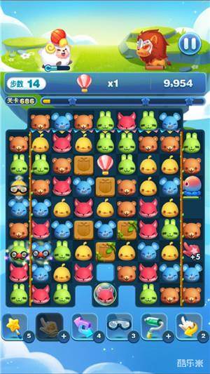 这一关棋子分布的很集中,十分有利于我们来制造出像旋风小丑或者是目镜射线这样的道具出来,然后利用这两个道具的力量,能够快速的帮我们收集加五步的棋子,另外当我们消除进行到下一个布局的时候,你会发现所有的气泡棋子全部都被冰块困住了,我们必须打破这些冰块将这些气泡棋子解救出来,然后进一步的将它们打破,让水位快速的上升。只要水位上升了,剩下的我们就只需要慢慢的消除气球上方位置的棋子就可以了,