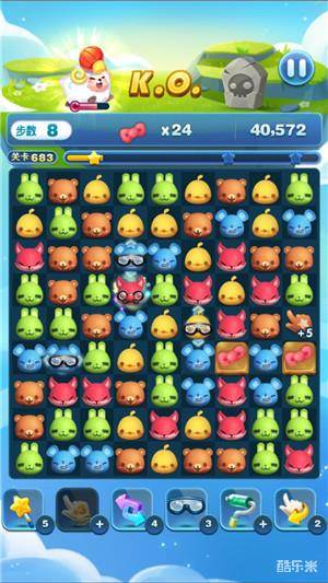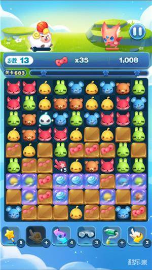 经过上面的简单分析,并不是所有蝴蝶结都摆在眼前的,有些是需要我们先消除它们的表面障碍才行,可以把简单的收集起来,然后再攻破那些难点。除此之外,此关还夹杂了一些果冻障碍,穿插在蝴蝶结中间,要想消除它们足够的步数是必要的保证。我们可以看到,主要棋子还是集中在上半部分,障碍都集中在下半部分,所以我们主要的方向就是往上往下消除。当前来看,可以滑动的棋子还是不少的,先走几步看看,大概一两步的样子,我们就很幸运的制作出了暴走幽灵,幽灵的可塑性还是很强的,这就要看我们平常对道具的把握程度了。
