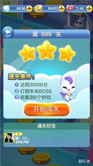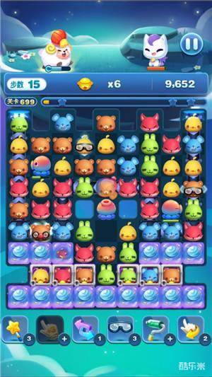 这一关的主要任务就是收集6个铃铛,也就是将挂有铃铛的同色棋子收集成功就可以了。这一关的地形不是很完整棋子分布的也很零散,一开始的时候6个铃铛棋子都位于底部的位置,并且全都被框架牢笼困住了,所以我们必须先解除这些障碍,然后才能想办法去收集它们。