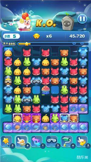 之后我们还会在下方位置看到很多个点心冰块,都是四层的,普通棋子至少需要消除四次才可以。这6个铃铛棋子都被冰块压在下面,必须将这些冰块都打碎,然后棋子才能逐渐的显露出来。打破这些冰块只能是不断地消除它旁边的同色棋子,并且在消除的时候你会发现也是越来越集中,十分有利于我们制造出像目镜射线和旋风小丑这样的特殊道具出来,然后我们利用这些道具就能在最短的时间打破所有的障碍。