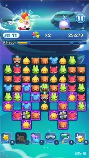 这一关的主要任务是收集两朵四叶花,也就是不断地消除四叶花旁边四种颜色的棋子就可以了。这一关的地形十分奇怪,毫无规律。棋子分布的也很零散,所以我们在消除棋子的时候一定要注意观察棋子下落的规律。这关的两朵四叶花是位于底部的位置,并且它们的周围都有一个棋子,都是单独存在的,所以想要依靠这几个单独的棋子是不可能收集四叶花完成任务的,因此我们必须利用特殊道具的力量才有可能闯关成功。