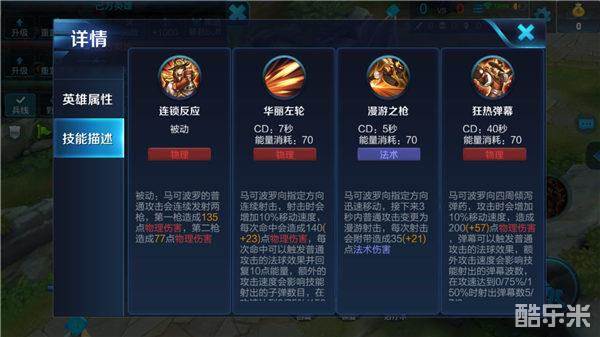 一技能——华丽左轮:一技能是马可波罗的输出技能,施放时能增加自身的移动速度,命中敌人时能够恢复能量,攻速越高打出的子弹数目越高,因此马可波罗在出装上可以选择更多的攻速装备。