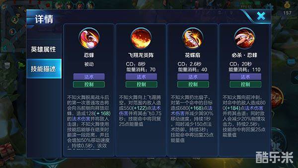 分析:被动技能有两个效果:1、在脱战后,不知火舞的第一次普攻可以向前释放忍蜂,击退目标的同时造成法术伤害。这无形之中提高了不知火舞的输出手段,特别是让不知火舞在中期游走阶段可以有更强的抓单秒人的能力;2、不知火舞释放技能后可以翻滚一段距离,并且获得移速加成。玩家可以利用此技能追击敌人或者逃生,在团战中释放技能的同时还可以不断调整自己的输出位置。这里有个小技巧推荐给大家:在一级的时候不知火舞可以利用被动及二技能率先向敌人发难,只要二技能命中敌人,玩家可以释放忍蜂攻击并击退敌人,随后翻滚拉开敌我之间的距离。这样做可以直接在一级时压低敌人血量,进而提高自己的对线统治力。