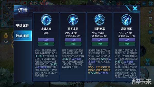 被动技能:冰封之心,王昭君在脱离战场后会获得抵免伤害的护盾,如果护盾被敌人击破会给敌人造成法术伤害和减速。