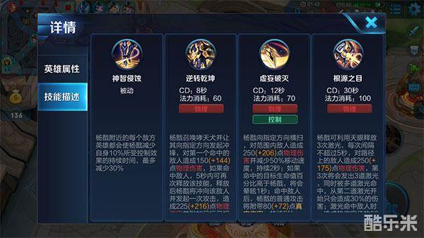 三技能-根源之目:AOE伤害加回复技能,一共可以释放三次,每次命中敌人都会造成伤害并回复高额的生命值,在前期对线可以利用三技能来提升自己的续航能力,在团战中,三技能的回复也可以提升杨戬的抗伤能力,让他可以吸收更多的伤害。不过释放这个技能的时候杨戬需要预判下敌人的走位,不然很难打出高额的伤害。