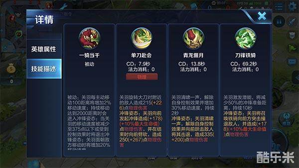 破军:巨额的物理攻击能极大的增强关羽的输出伤害,被动效果让关羽能够对生命值较低的敌人造成更高的伤害,对付残血的敌人可以一刀秒杀。